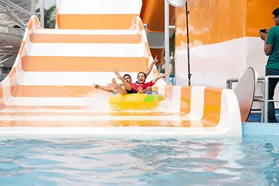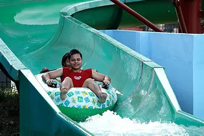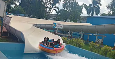 The “Thunder Bowl” ride is popular in water parks the world over. Two riders on a raft descend from a tower height of 40ft. through a tunnel length of 195ft. until they reach a big bowl of 40ft. diameter for two circular exciting revolutions and will finally exit into a sofa landing. Enjoy the rides at the best water resort in kolkata.