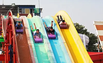 “Tornado Funnel” is a cone-shaped dia of 40ft. in which two riders at a time slide down on a raft entering through a tunnel length of 260ft. from a tower height of 40ft. with a momentary zero-gravity experience. The centrifugal forces keep the riders high on the wall for several turns and after a series of exciting oscillations through the funnel, they descend into a closed tunnel and splash into a pool of crystal clear water.